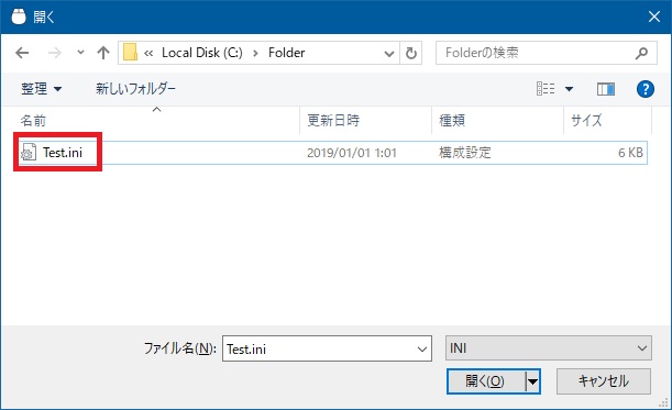 「ユーザー定義INIを使用」で「C:\Folder\Test.ini」を指定します。