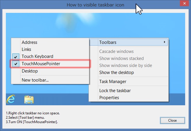 In this case, please turn on TouchMousePointer menu in right click menu of taskbar.