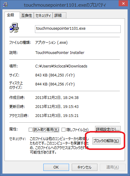 または、ダウロードしたファイルをエクスプローラ上で右クリックしてプロパティを出し、「ブロックの解除」をすると回避できます。