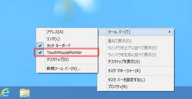 他のユーザーでもアイコンを表示させるには、ツールバーの余白を右クリックして「ツールバー」を選んで「TouchMousePointer」をONにすると表示されます。
